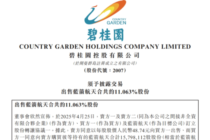 碧桂园忍痛“割肉”。4月25日,碧桂园控股宣布,已达成出售蓝箭航天约11.063%股份的交易,总代价13.05亿元。此次交易完成后,碧桂园将不再持有蓝箭航天的任何权益。